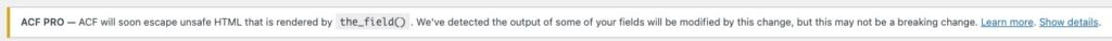 If your site uses ACF pro then you’ve probably been seeing the warning in your WP dashboard that says “ACF will soon escape unsafe HTML that is rendered by the_field(). Click on learn more, you can see the article here which shows how to fix it. Some of this article has exact references to the original article from Advanced Custom Fields.