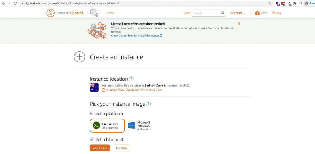 - Go to https://lightsail.aws.amazon.com and create a linux instance. You should select the region that is closest to you. In my case that would be Sydney.