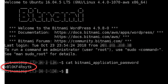 5. Once you SSH to your instance in the browser, the terminal will open and you run this command below to get your WordPress username and password. By default your wordpress username will be ‘user’ but the password will appear in the terminal as circled.